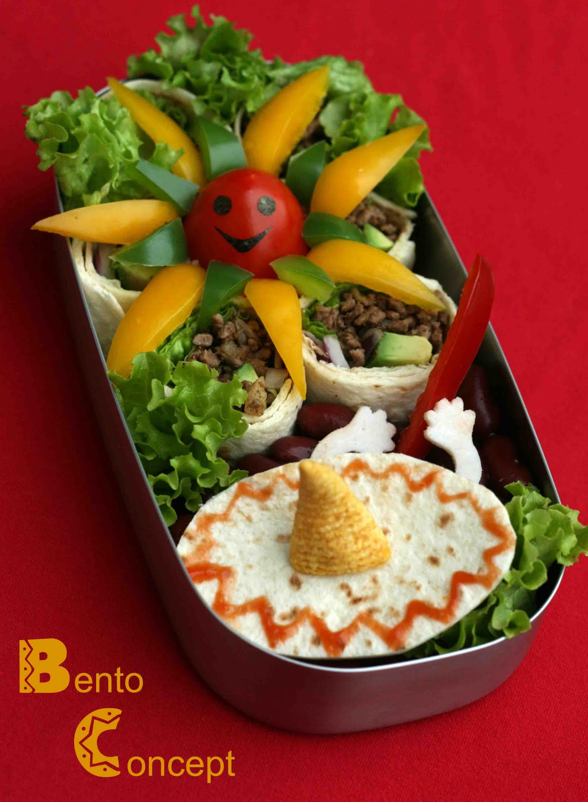 Dans ce bento Mexicain : une salade d’haricots rouges ; une tortilla roulée avec un mélange viande-oignon assaisonné à la mexicaine, oignon rouge cru, avocat, salade ; piñata en tomate et poivron ; sombrero en galette tortilla et « un produit soufflé à base de farine de maïs » (pour ne pas faire de pub) ; les bras du Mexicain sont en jambon de poulet et le bâton pour casser la piñata est un bâtonnet de poivron rouge.